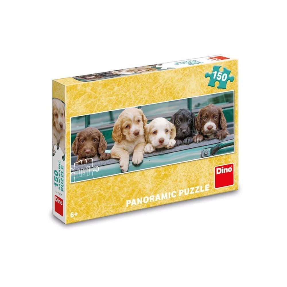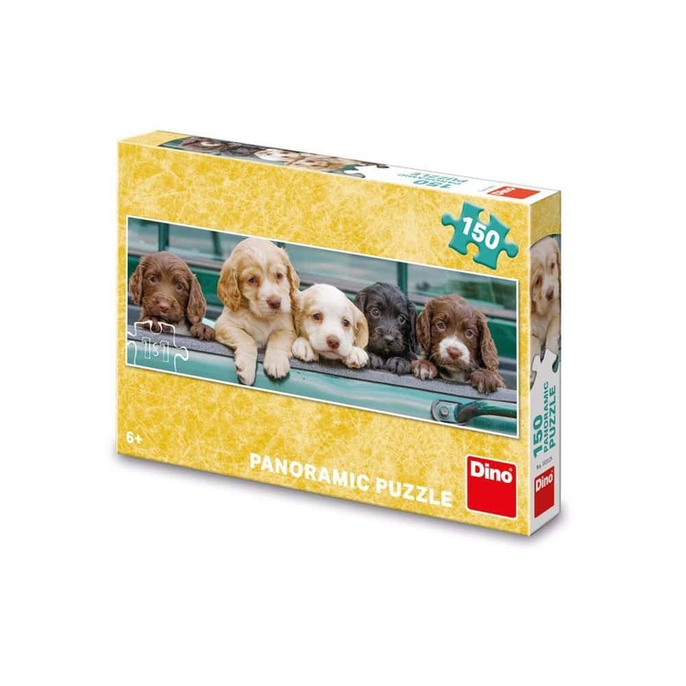 - Puzzle-ul cu 150 de piese are o incantatoare imagine cu cinci catelusi. Formatul panoramic al puzzle-ului il face perfect pentru decorare.