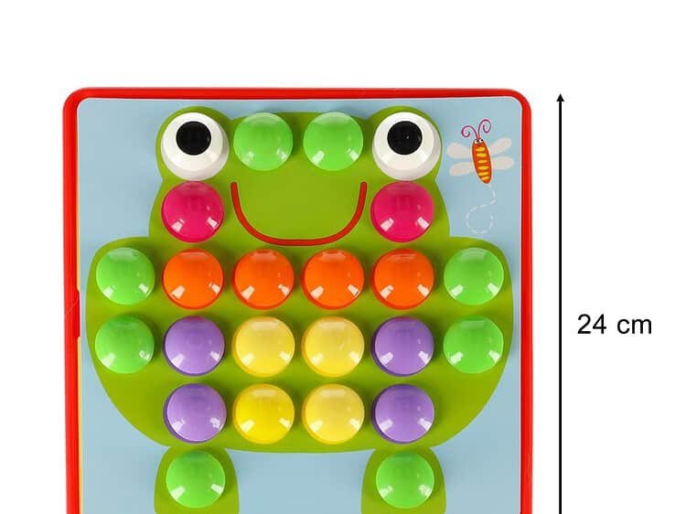 Button Mosaic este un puzzle educațional fantastic pentru a sprijini, de exemplu, învățarea culorilor, numărarea. Setul colorat conține 45 de nasturi, 10 planșe, un recipient de depozitare. Dimensiunile plăcii: 24x24cm, dimensiuni buton 3.5×2.5cm, recipient:25.5×25.5x4cm.