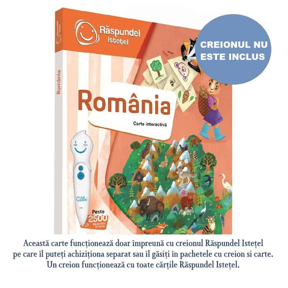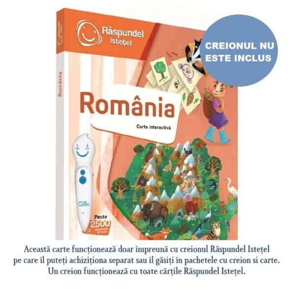 - Caprita neagra Rupi, impreuna cu bursucul poet Rares si jucausa marmota Oana le povestesc copiilor cu ajutorul creionului Raspundel Istetel mii de lucruri interesante despre Romania! Cum s-a format tara noastra, ce vecini are, cate judete, care sunt cele mai importante forme de relief, ce animale si ce plante traiesc in tara noastra, dar si ce resurse naturale avem, cum sunt ele folosite, care sunt cele mai interesante monumente din tara si ce oameni nascuti in Romania au schimbat lumea cu inventiile sau cu imaginatia lor! Cartea contine peste 3.000 de sunete, informatii si teste din care copiii vor invata lucruri fascinante si utile, in timp ce parcurg cartea in ritmul lor, jucandu-se si distrandu-se cu personajele create special pentru ei.