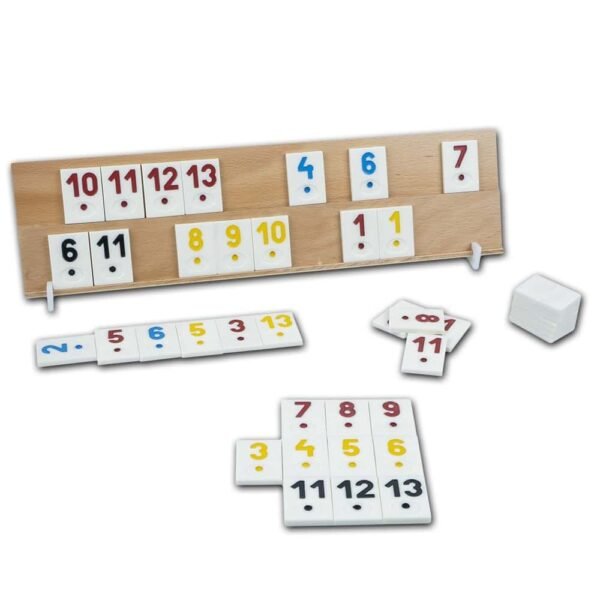 - Mod de joc: jucatorii tin piesele in timpul jocului in asa fel incat sa nu fie vazute de jucatorii adversi. Piesele trebuie aranjate pe tabla in asa fel incat sa se obtina serii si suite. O serie este o formatie de piese cu aceeasi valoare, dar de culori diferite. O suita este o formatie in care piesele au valori crescatoare si sunt de aceeasi culoare. Ambele tipuri de formatii trebuie sa contina cel putin 3 piese. O serie poate fi formata din maxim 4 piese, in timp ce suitele pot fi formate din maxim 14 piese, de la 1 pana la 13, + 1. Inainte de a incepe jocul piesele sunt amestecate cu fata in jos si grupate in gramezi de cate 7 piese si asezate pe masa de joc, astfel va ramane o piesa negrupata care se va intoarce si va fi considerat atu-ul jocului. Fiecare jucator primeste 14 piese exceptand primul care are 15. Inainte de inceperea jocului se pot schimba piesele duble. Daca la inceputul jocului cineva are pe tabla piesa intoarsa ca atu, atunci el va primi 50 de puncte. Jocul se poate juca in moduri diferite: etalare (jucatorii formeza suite si formatii ce vor fi coborate pe masa cu fata in sus). joc simplu pe tabla (jucatorii fac suite si formatii pe tabla / castiga cel care reuseste primul sa aibe formatii si suite complete), mozaic (castiga jucatorul care are pe tabla suita completa, de la 1 la 13 + 1, de culori diferite, fara a avea 2 piese de aceeasi culoare una langa alta, iar primele 4 piese 1-4 sa fie fiecare de alta culoare). bicolor (jucatorul trebuie sa aiba pe tabla suita 1-13+1 in doar 2 culori, fara a avea piese de aceeasi culoare una langa alta), monocolor (jucatorul trebuie sa aiba pe tabla suita 1-13+1 de o singura culoare).