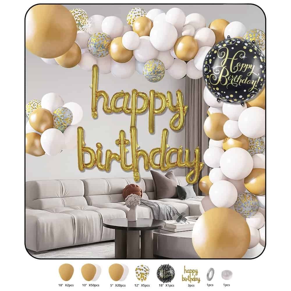 - Setul contine baloane din latex (2 bucati aurii de 46 cm, 50 bucati aurii si albe de 25 cm, 20 bucati aurii si albe de 13 cm, 5 bucati transparente cu diametrul de 30 cm, ce contin confetti aurii), 1 balon din folie de aluminiu neagra cu diametrul de 46 cm, insciptionat Happy Birthday, urarea Happy Birthday formata din doua segmente din folie de aluminiu aurie, precum si accesorii pentru fixare (1 rola rafie 5 m x 0.5 cm, 1 rola banda adeziva cu latime de 1.5 cm si 20 buline dublu adezive transparente).