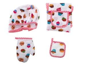 Un set frumos pentru un mic ajutor de bucătărie. Va fi pe placul fiecărui copil. Șorțul va proteja hainele copilului în timp ce gătesc împreună. Material: poliester/lemn/metal. Dimensiunile șorțului: 45,5×54 cm. Lungimea rolei: 20 cm.