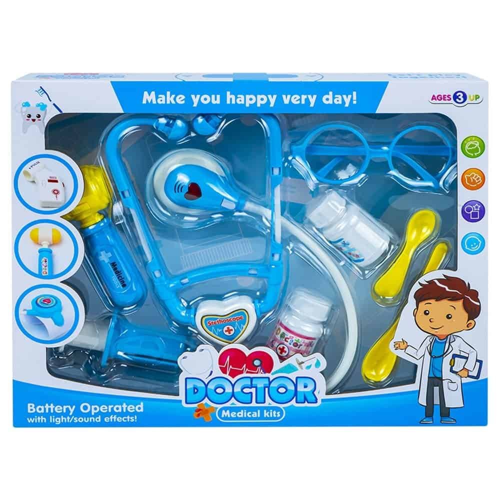 - Setul contine: stetoscop, seringa, ciocanel, 2 flacoane pentru medicamente, ochelari, 2 lingurite.