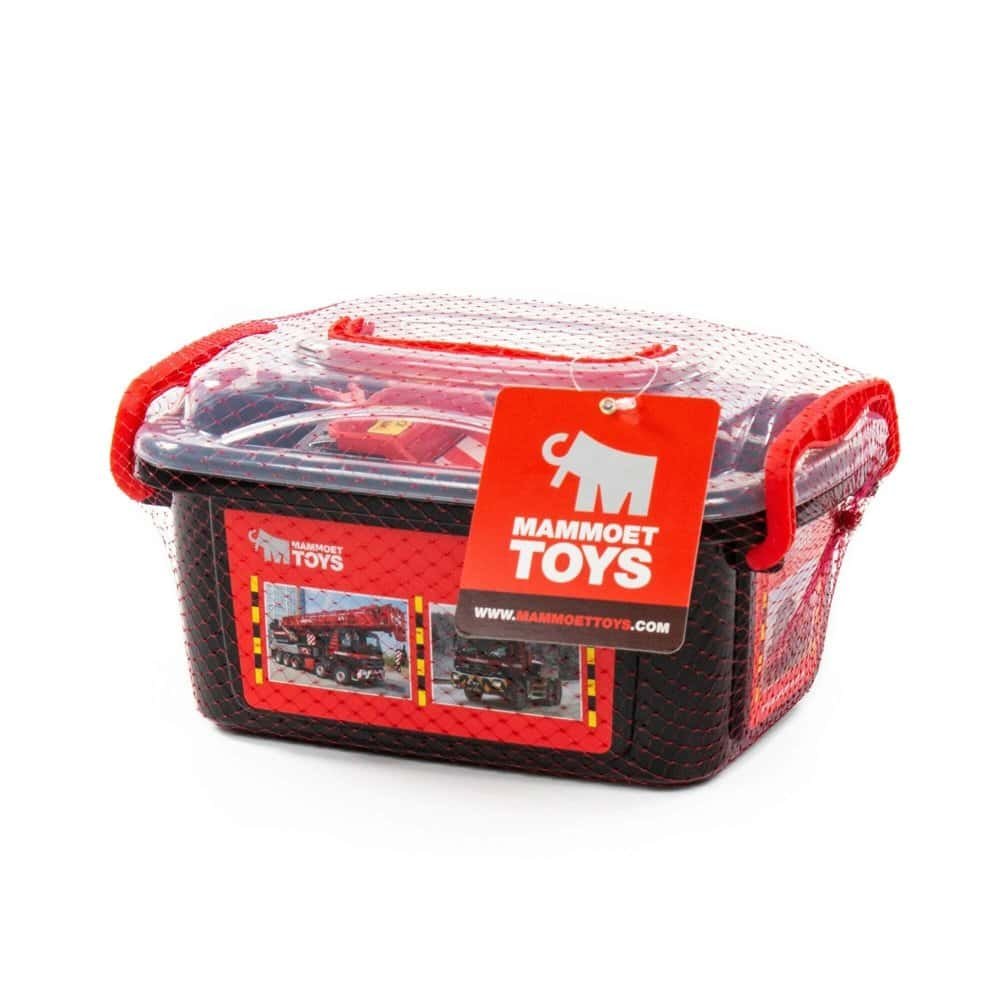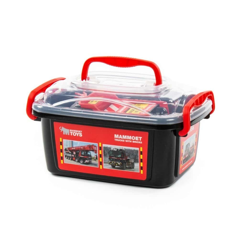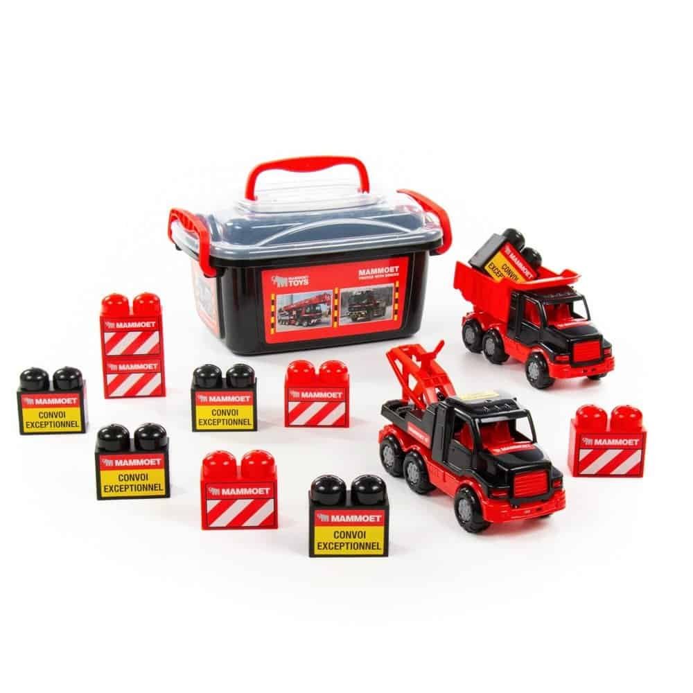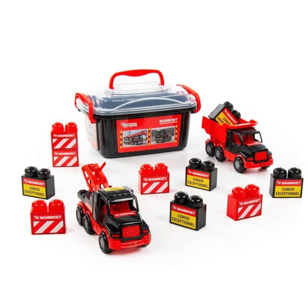 Setul contine doua mini-camioane Mammoet (o autobasculanta si un camion de tractare) si zece blocuri mari de constructie de culoare rosie sau neagra, asezate intr-o cutie de depozitare din plastic, prevazuta cu un maner.