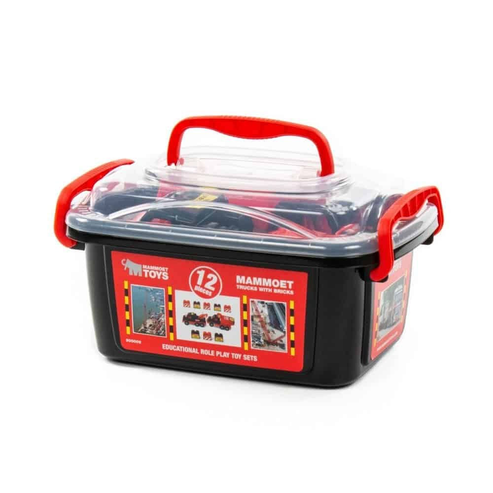 - Setul contine doua mini-camioane de constructii (o autobasculanta si un camion de tractare) si zece blocuri mari de constructie de culoare rosie sau neagra. Acestea sunt asezate intr-o cutie de depozitare din plastic rezistent, prevazuta cu un maner pentru transport usor.