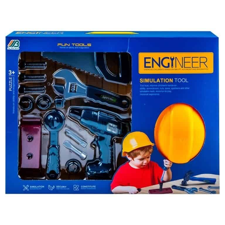 - Setul contine: 1 bormasina, 2 varfuri pentru bormasina, 1 cheie clinchet, 1 adaptator pentru clinchet, 1 cheie franceza, 1 fierastrau, 3 suruburi, 3 piulite, 2 piese cu decupaje pentru atasare suruburi si 1 casca, unelte si accesorii grozave pentru micul meserias.
