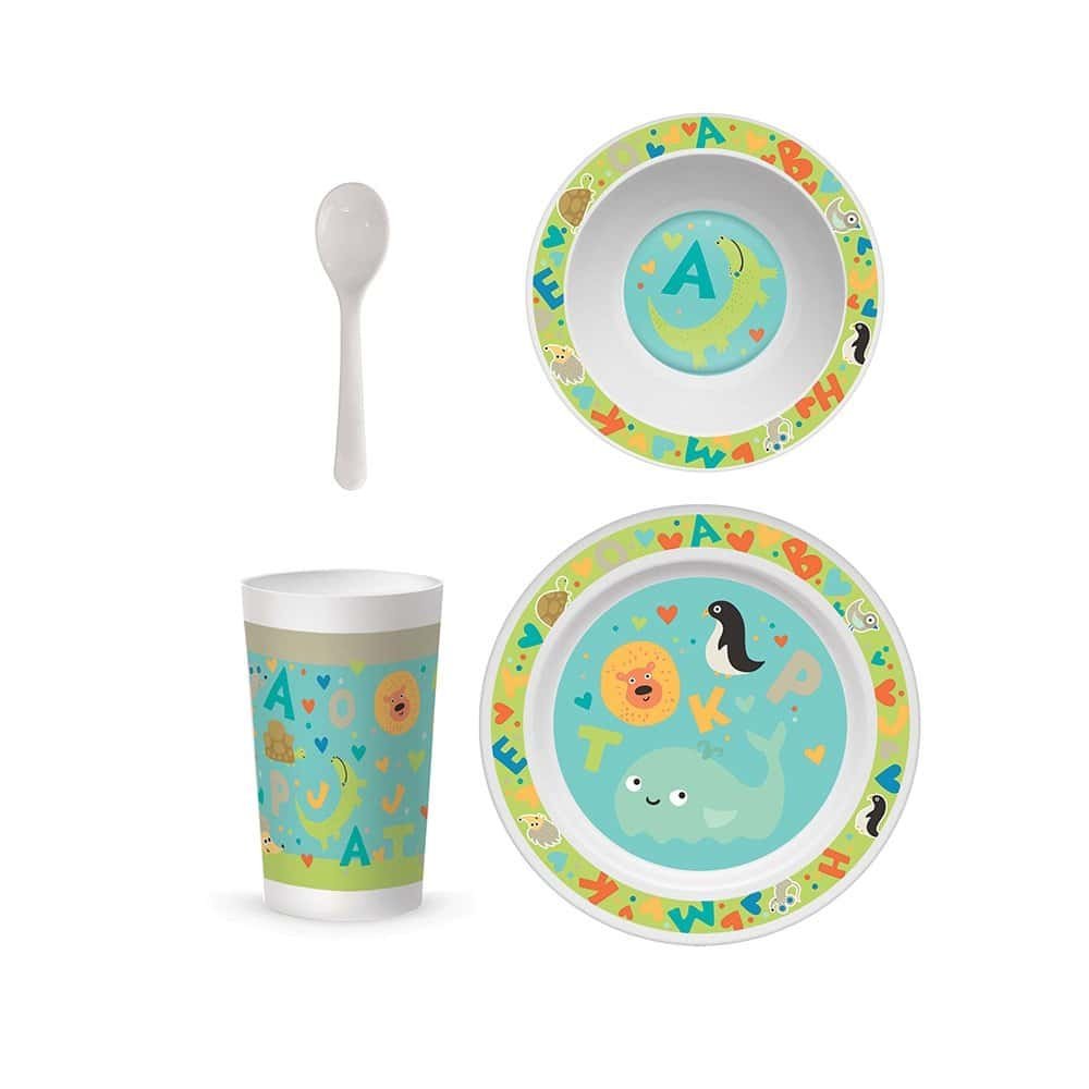 Setul imprimat cu animalute si litere, in culori vii, va incuraja pe orice copil reticent spre a manca.