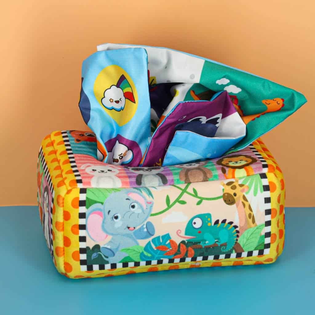 Căutați o jucărie care să vă încânte bebelușul în timp ce îi stimulează dezvoltarea motorie și senzorială? Acest adorabil sortator Montessori sub forma unei cutii moi cu șervețele colorate și țesături cu model este un hit! Produsul a fost conceput cu gândul la cei mici - sigur, durabil și ușor de curățat.