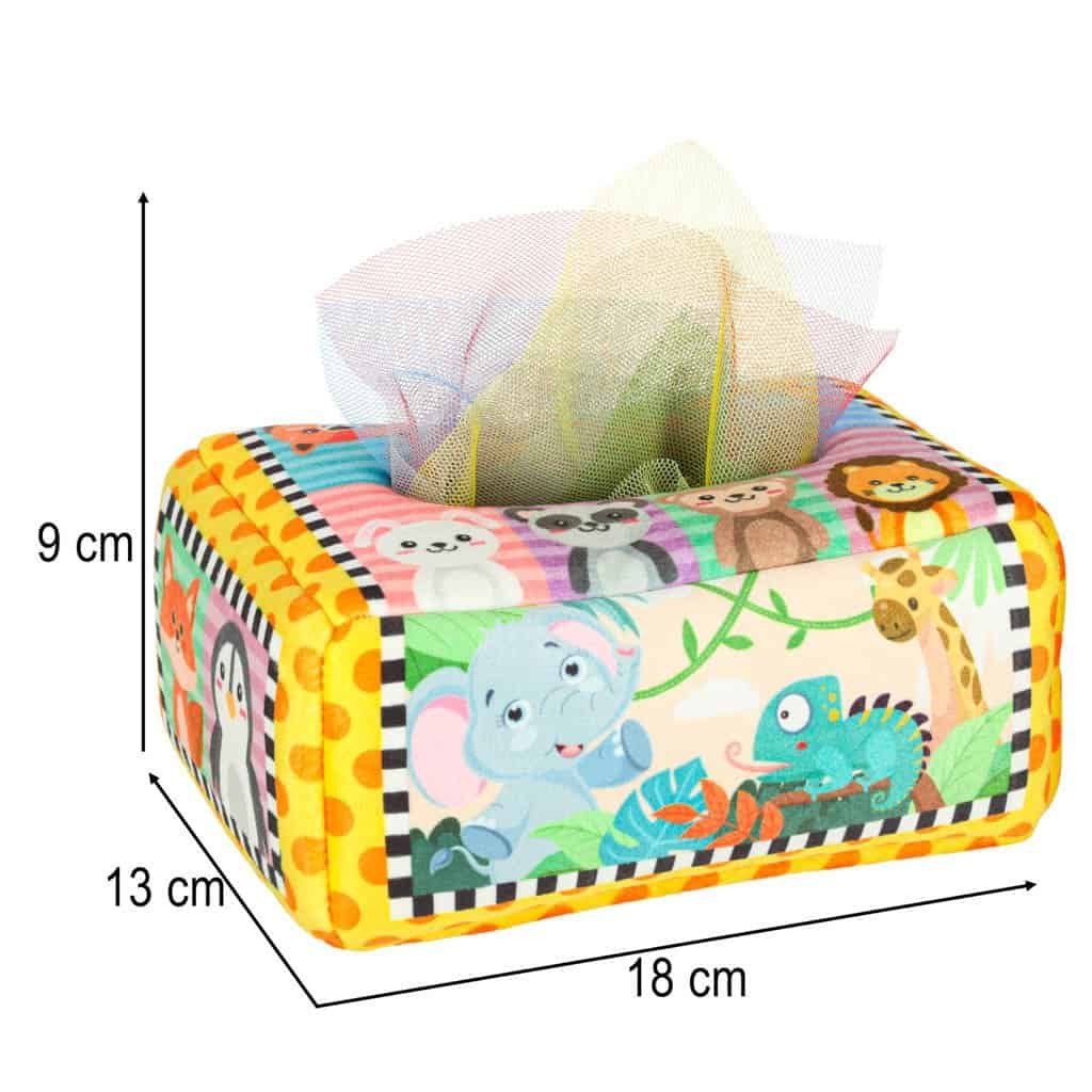 Set senzorial colorat pentru copii 3+: recipient moale cu pereți care foșnesc, 3 șervețele mai groase cu film senzorial și scârțâitor, 11 șervețele cu ochiuri. Motivele diverse dezvoltă simțurile, abilitățile motorii și curiozitatea copilului mic.