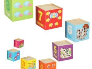 - 8 blocuri din lemn, colorate, de dimensiuni crescânde (de la 4,6 x 4,6 cm la 14 x 14 cm)