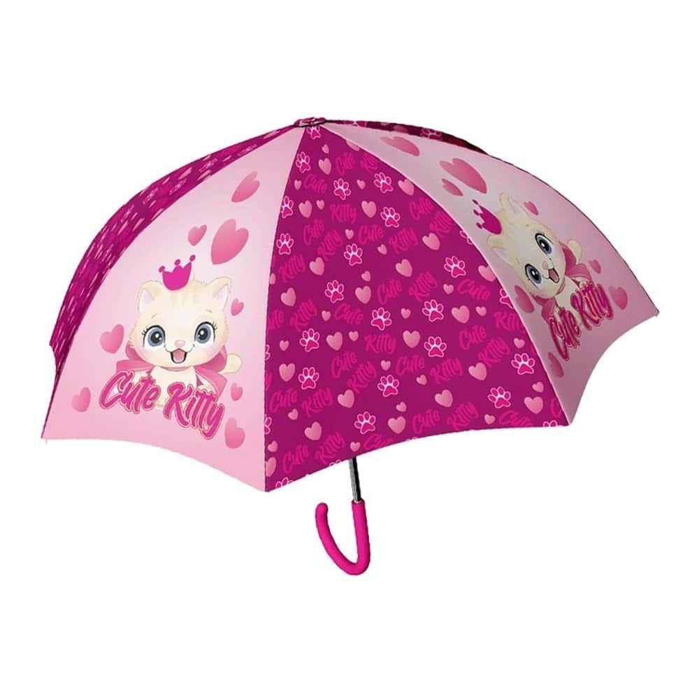 - Umbrela este confectionata din PVC imprimat cu desene simpatice CUTE KITTY. Cadrul si spitele sunt din metal.