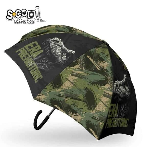 - Umbrela este confectionata din poliester imprimat cu desene dinozaur. Cadrul si spitele sunt din metal.