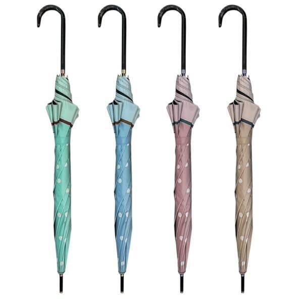- Umbrela este confectionata din poliester impermeabil, cu imprimeu cu buline pe partea exterioara si unicolor pe interior. Materialul impermeabil asigura protectie eficienta impotriva ploii.