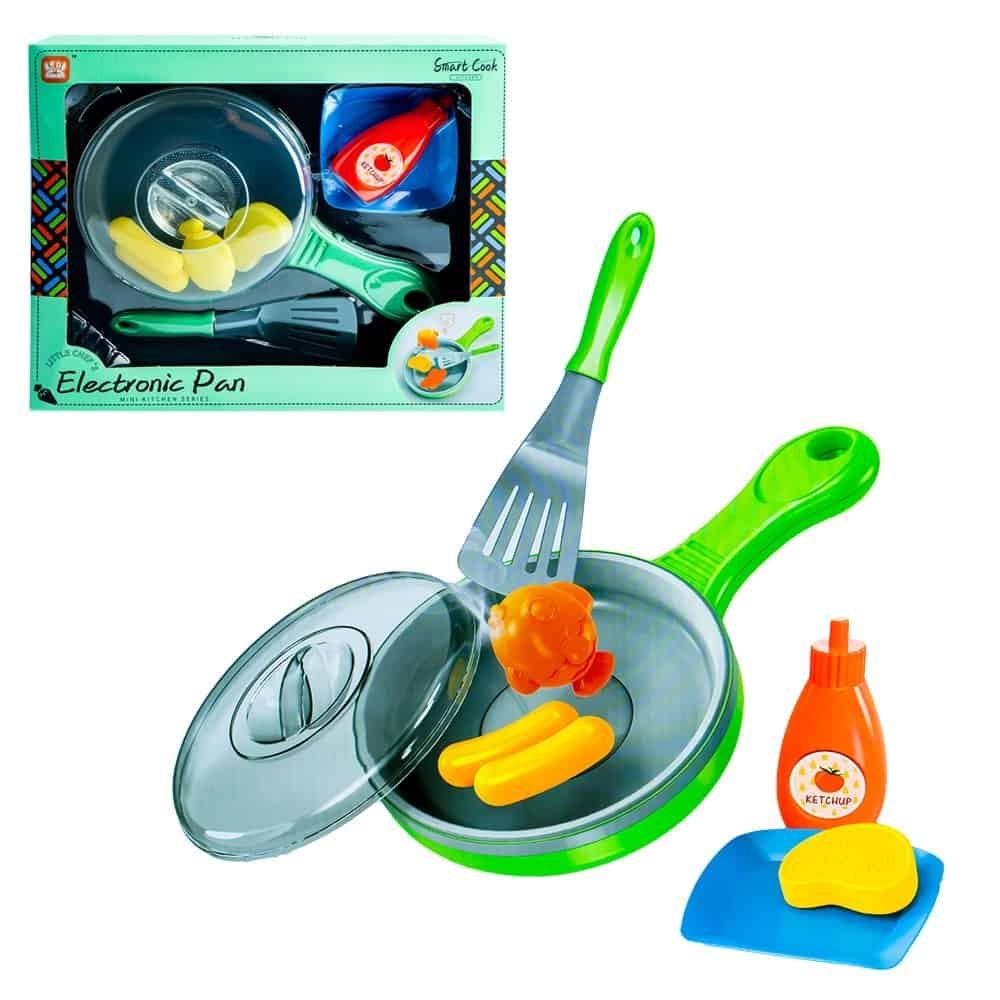 - Kitul contine: 1 tigaie cu capac, 1 paleta, 1 platou, piese ce imita mancarea (1 bucata de friptura, 2 carnaciori, 1 peste), 1 sticla pentru ketchup.