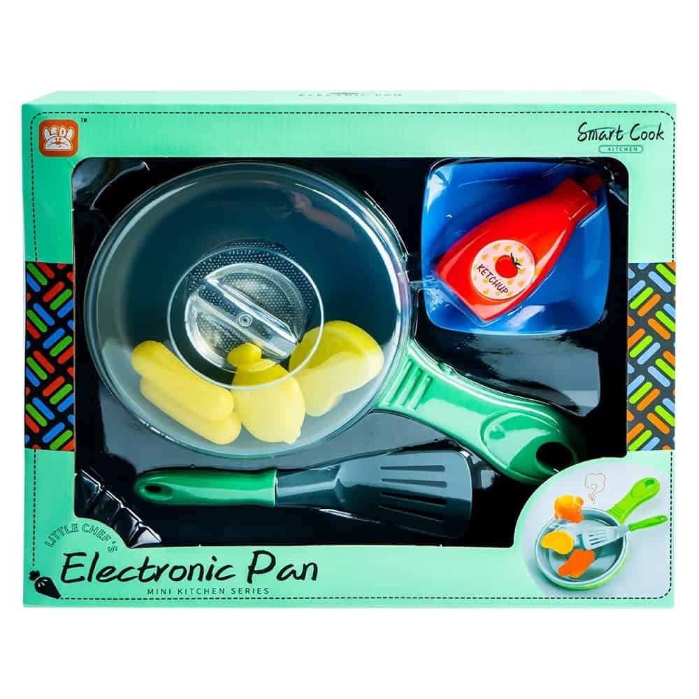 - Setul contine: 1 tigaie cu capac, 1 paleta, 1 platou, piese ce imita mancarea (1 bucata de friptura, 2 carnaciori, 1 peste), 1 sticla pentru ketchup.